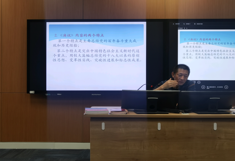 徐飞带领同学们回顾了党百年历程上的前两个历史决议产生的历史条件、时代背景和重要意义。他指出,距离第二个历史决议的制定已经过去了40年,40年来我们党和国家事业大大向前发展,《中共中央关于党的百年奋斗重大成就和历史经验的决议》就是在这样一个应当总结而且能够总结的重大历史时刻提出的。《决议》通过对党的奋斗历史的回顾和所取得的重大成就的总结,对我们从历史中汲取力量并从中获得继续前进的动力和智慧有重要意义。