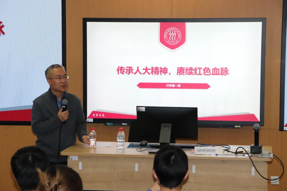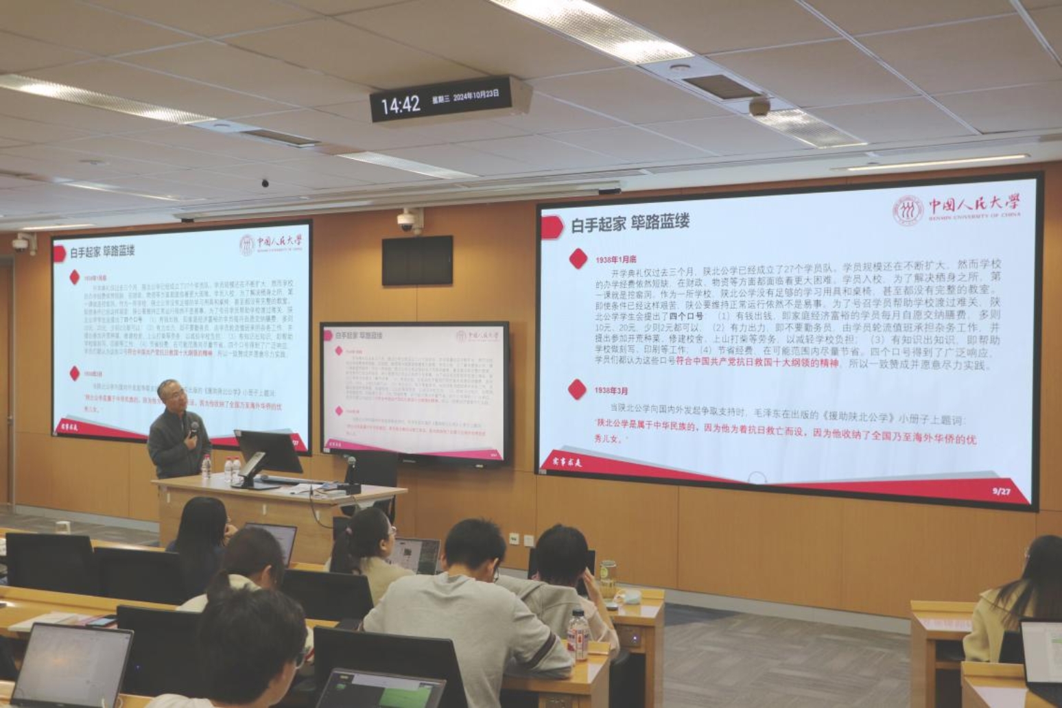 石德才以“传承人大精神 赓续红色血脉”为题,围绕中国人民大学及其前身在抗日战争、解放战争、新中国成立与建设、改革开放到进入新时代各时期的峥嵘历史,讲述了中国人民大学在抗日烽火中诞生,在党的关怀下发展壮大的光荣革命传统和鲜明红色基因,展现了“党办的大学让党放心、人民的大学不负人民”的精神品格。