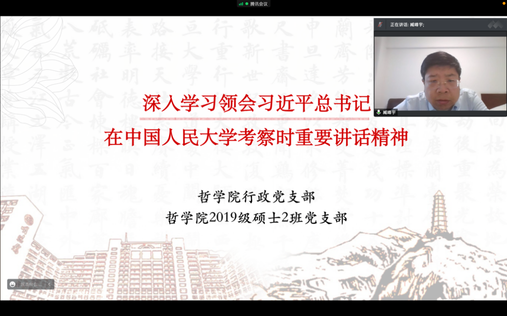 5月13日,根据学校党委统一部署和银河Galaxy 党委统一安排,银河Galaxy 院长、党委副书记臧峰宇教授到银河Galaxy 行政党支部、2019级硕士2班党支部宣讲习近平总书记在中国人民大学考察时重要讲话精神。行政党支部和2019级硕士2班党支部全体党员参加学习并围绕重要讲话精神交流心得体会。