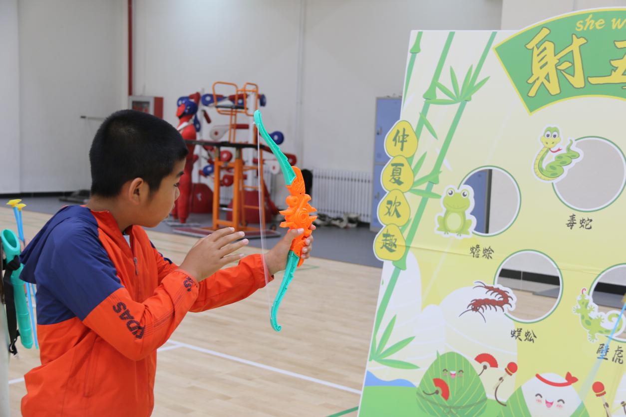“弦惊百毒”射五毒活动则充满了驱邪避疫的节日气息。小朋友们张弓搭箭,瞄准“五毒”标靶,寓意驱除病害,祈求健康平安。紧张刺激的射箭过程,让小朋友们深刻领悟了端午节除害防病的传统内涵,体会儿童节的快乐。