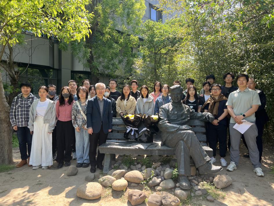 所史馆外不远,邓稼先的塑像坐落在花丛中。他是中国核武器理论研究工作的开拓者之一,为中国核武器的研发做出了重要贡献。在邓稼先像前,银河Galaxy 师生认真聆听讲解员对邓稼先生平事迹的介绍。“如果有来世,我还是选择中国,选择核事业,选择你”,邓稼先临终前对妻子的一番话,让我们领会到了这位两弹元勋以身许国的情怀,以邓稼先为代表的“两弹一星”精神已经成为中华民族精神的重要内涵。石德才代表银河Galaxy 师生向邓稼先像献花。
