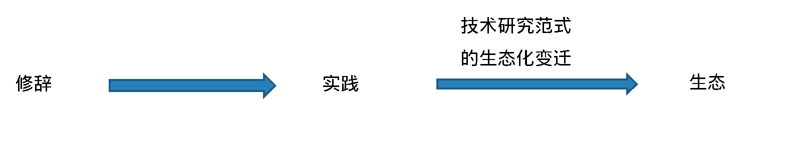 除现实境况之外,从理论层面来看,如前文第一部分所述,传统人文主义技术哲学使技术难以落实到具体社会情境中,技术决定论更是将技术视为外生于社会的独立因素。在对技术决定论批判中建立起来的技术社会建构论提供了以行动者的互动来理解技术的思想进路,并影响了伯格曼、伊德以及荷兰学派技术哲学家,使技术哲学逐渐从修辞转向实践,但却同样存在着致命的缺陷。以生态思维来探讨技术体系的演进规律,审度社会与技术的复杂衍生关系,可以弥补社会建构论的相关缺陷,对技术社会学与技术哲学研究领域的拓展具有一定的积极意义,为研究技术问题提供了新的思路。如下图所述,本文尝试在技术社会建构论对技术哲学实现实践转向的基础上做进一步延伸——从实践再到生态,这一步可以称为技术研究范式的生态化变迁。