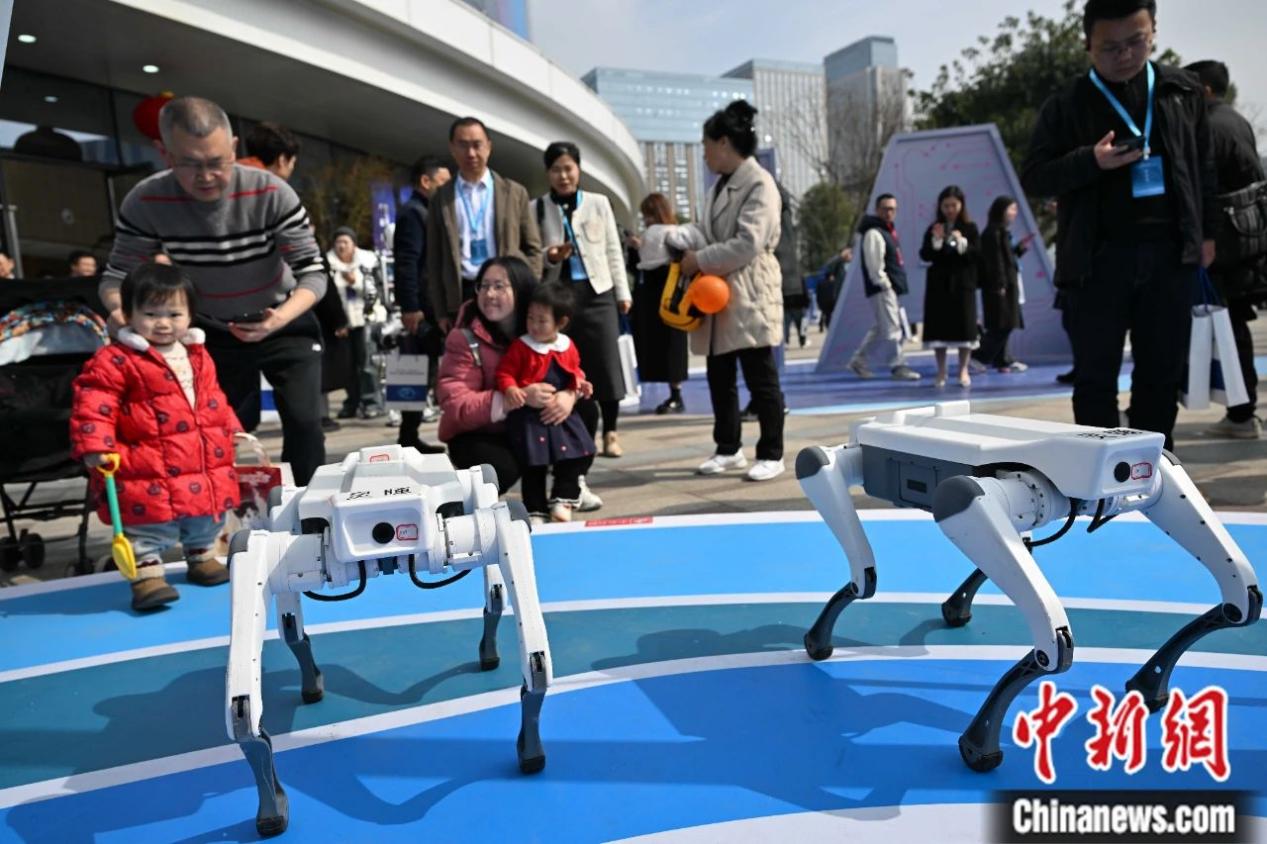 2025年3月19日, “开启大模型•��������遇见机器人”——四川省人工智能产业链产品发布会在成都举行。图为四足机器人吸引参观者。中新社记者 张浪 摄