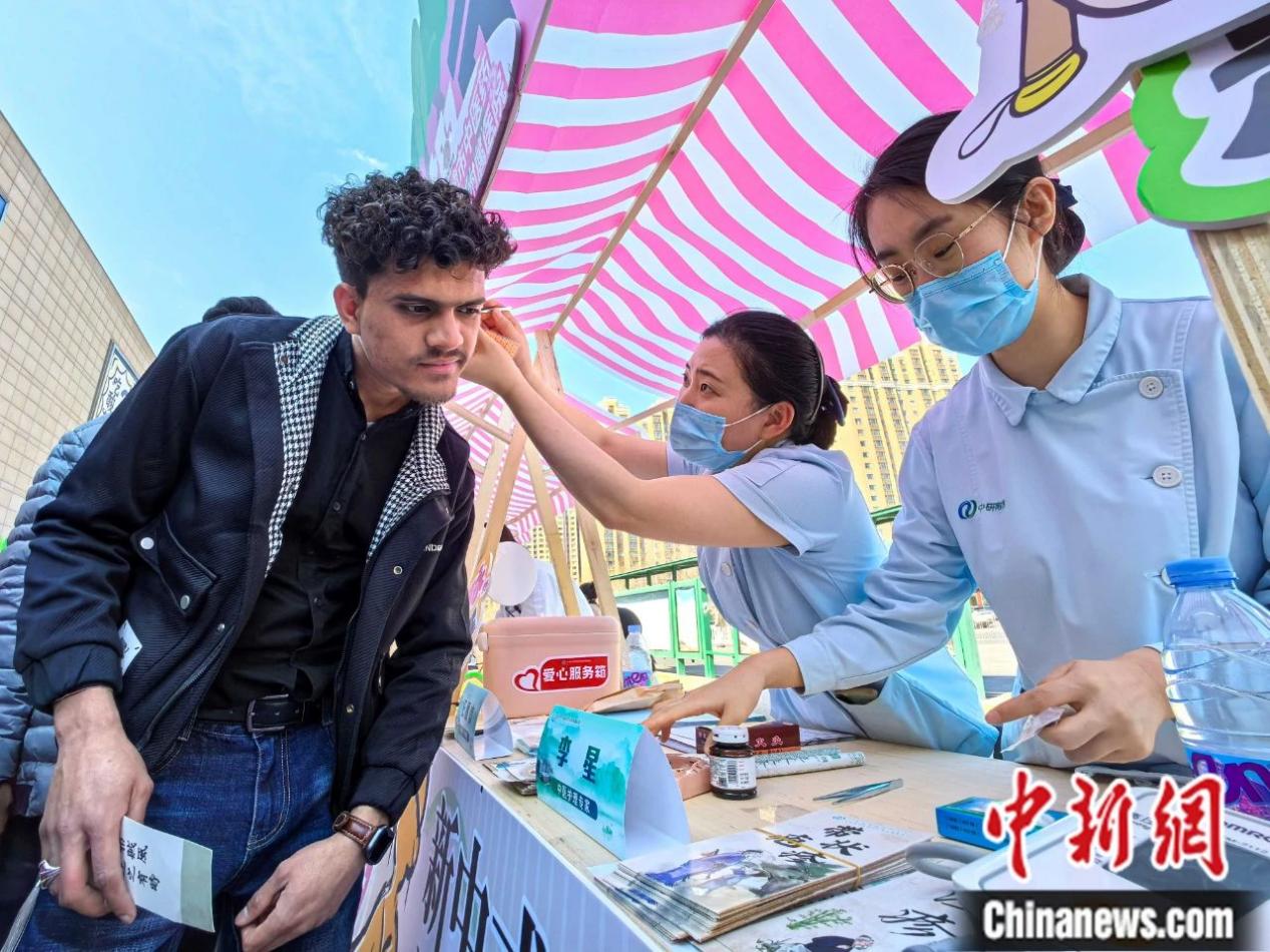 2025年3月21日,2025年天津市中医文化市集首站在天津市红桥区启幕。图为巴基斯坦留学生体验中医耳针。中新社记者 佟郁 摄