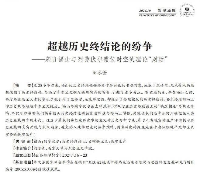 非常感谢《复印报刊资料·哲学原理》对拙作《超越历史终结论的纷争——来自福山与列斐伏尔错位时空的理论“对话”》的转载,也非常感谢《世界哲学》对拙作的刊发。非常荣幸有此机会能够分享写作过程的思考,请大家批评指正!