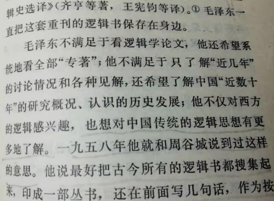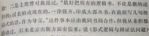 毛泽东读书秘书高路《毛泽东与逻辑学》,记录毛泽东构想:“毛泽东不满足于看逻辑学论文,他还希望系统地看全部‘专著’;他不满足于只了解‘近几年’的讨论情况和各种见解,还希望了解中国‘近数十年’的研究概况、认识的历史发展;他不仅对西方的逻辑感兴趣,也想对中国传统逻辑思想有更多地了解。一九五八年他就和周谷城说到过这样的意思。他说最好把古今所有的逻辑书都搜集起来,印成一部丛书,还在前面写几句话,作为按语。”[②]周谷城回忆:“主席曾对我说过:‘最好把所有的逻辑书,不论是新的或旧的,过去的或现在的,一律搜齐,印成大部丛书,在前面写几句按语式的话,作为导言。’”[③] 毛泽东构想文献记录,见图1。