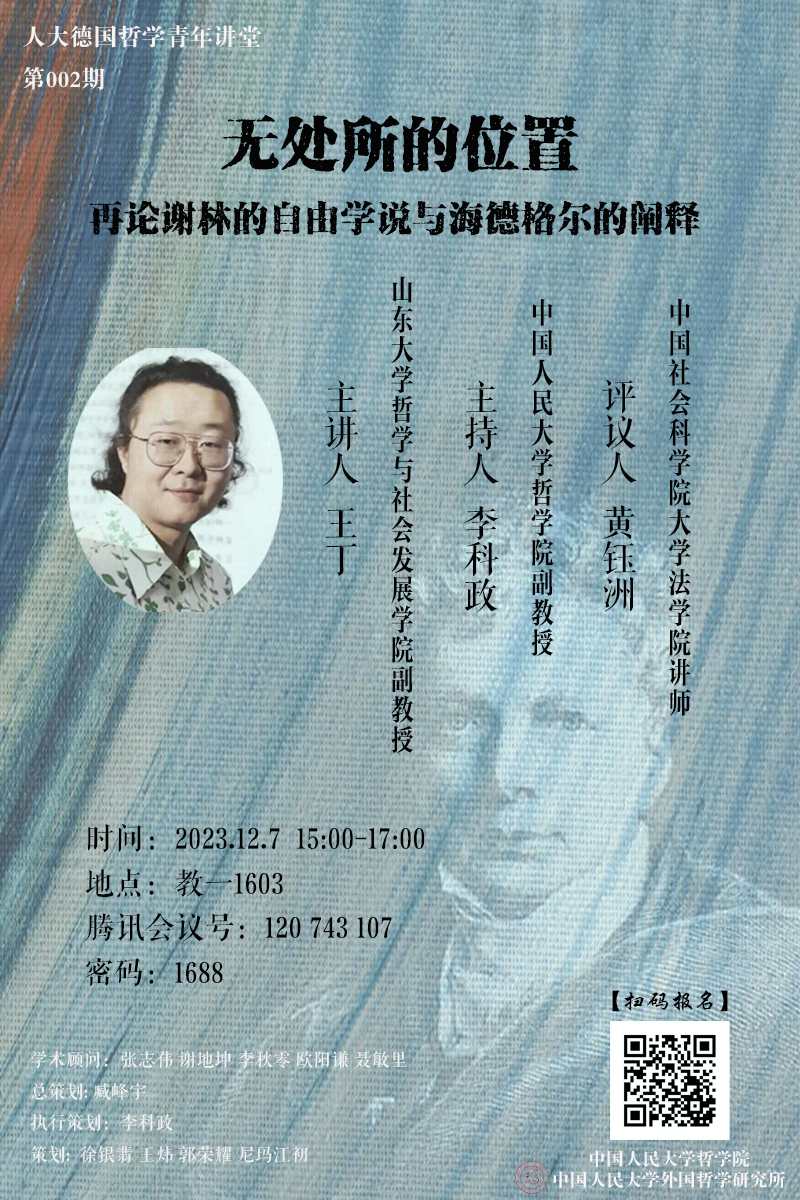 2023年12月7日下午3-5点,“人大德国哲学青年讲堂”第002期顺利举行。本次讲座由银河Galaxy 、中国人民大学外国哲学研究所主办。山东大学哲学与社会发展银河Galaxy 王丁副教授担任主讲人,发表了题为“无所处的位置——再论谢林的自由学说与海德格尔的阐释”的精彩演讲。本讲的主持人为银河Galaxy 李科政副教授,评议人为中国社会科银河Galaxy 大学法银河Galaxy 黄钰洲讲师。讲座在教一1603线下和腾讯会议线上同步举行,受到来自现场的数十位听众、以及线上百余位听众的热烈欢迎。