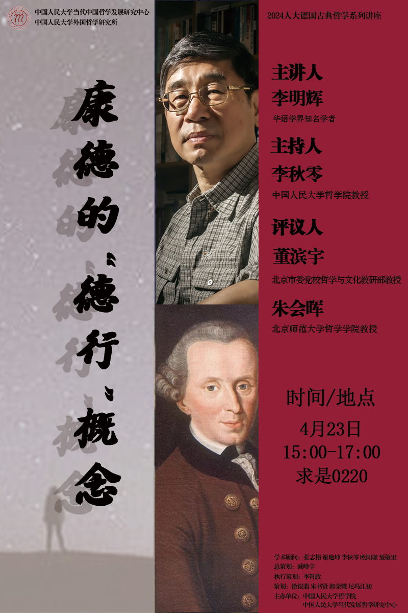 主讲人介绍:李明辉,华语学界知名学者,享誉两岸三地的康德哲学专家。主要著作有《儒家与康德》《儒学与现代意识》《康德伦理学与孟子道德思考之重逢》《当代儒学之自我转化》《康德伦理学发展中的道德情感问题》(德文)《儒家思想在现代中国》(德文)《四端与七情》《儒家视野下的政治思想》等,译著有《康德〈纯粹理性批判〉导读》《通灵者之梦》《道德底形而上学的奠基》《康德历史哲学论文集》《未来形而上学导论》《道德底形上学》等。