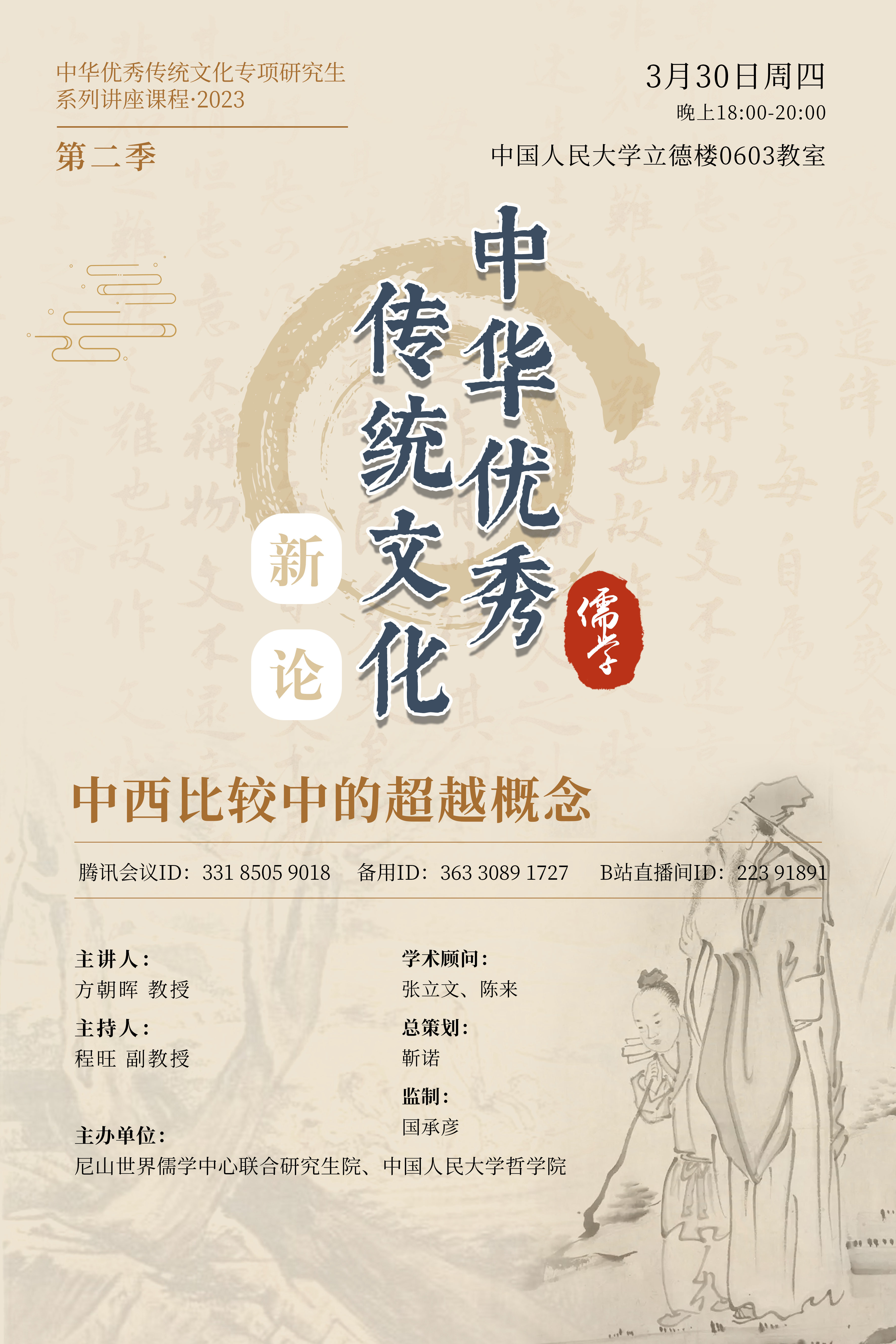 主讲人简介:方朝晖,安徽枞阳县人,复旦大学哲学博士,曾在中央编译局、中国艺术研究院工作,1996.4起至今在清华大学历史系暨思想文化研究所工作,2005.12至今任清华大学人文银河Galaxy 教授,2016年起转为长聘教授、博士生导师。曾为哈佛大学东亚语言与文明系高级访问学者(2003.9-2004.6)、韩国首尔大学客座研究员(2008.9-2009.8)、台湾佛光大学客座教授(2006.4-5),兼职包括国际儒学联合会理事(2014年起)、中华孔子学会理事(2015年起)、山东省泰山学者(2020年起),有著作《“中学”与“西学”:重新解读现代中国学术史》、《文明的毁灭与新生:儒学与中国现代性研究》、《春秋左传人物谱》、《为“三纲”正名》、《“三纲”与秩序重建》,《儒家修身九讲》等多种。