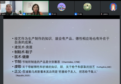 在互动交流环节,朱清华指出本次讲座的文本限定在柏拉图早期作品,也就是和苏格拉底德性思想有关的文本。关于德性不可教的部分,她认为亚里士多德意义上的人的自我实现是不能技能化的,不能筹划的。亚里士多德意义上的自我实现,最高的、接近神圣的沉思生活不能被技能化的。关于善良意志不被破坏问题,她指出古希腊意志这个概念存在的空间,并且就一些科学研究来看,意志也是可疑的。