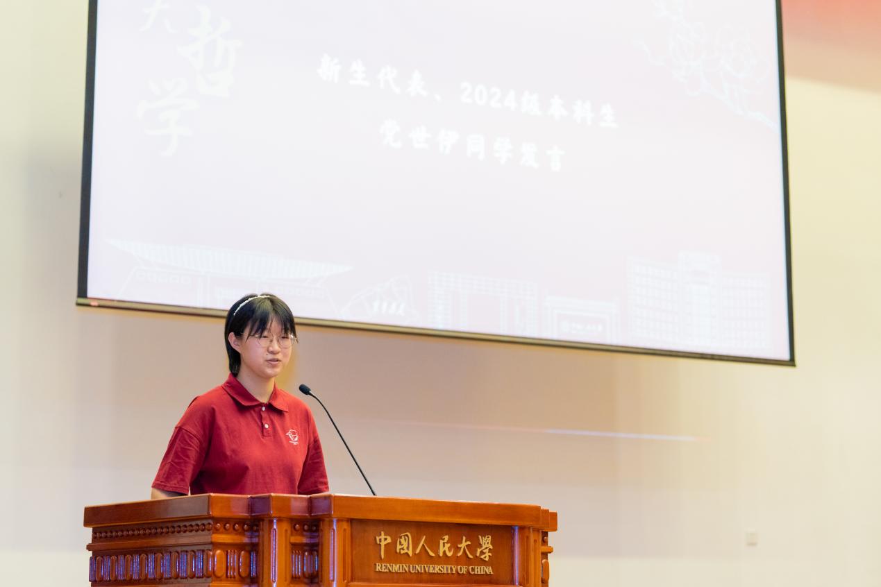 新生代表、2024级PPE专业本科生党世伊分享了自己对于求学人大的激动与期待。在她看来,人大银河Galaxy 是思辨的海洋,激发了自己批判性思维的火花;是充满探索的平台,让同学们在追求学术深度的同时探索人生的高度。她勉励各位同学,珍惜求学时光,秉持热情、智慧和勇气,探索哲学的奥秘,挑战哲学的未知,书写哲学探索者者的时代答卷。