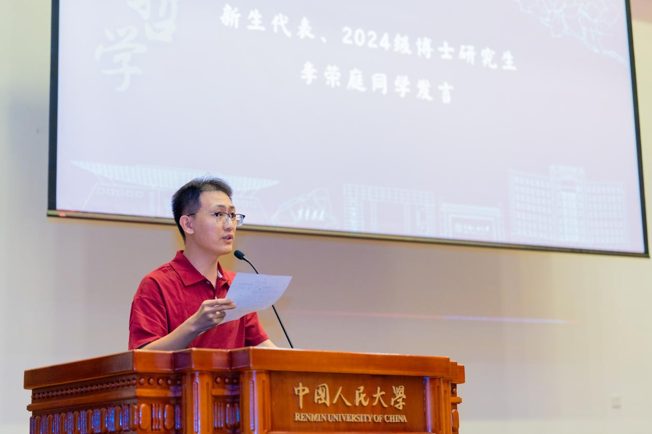 新生代表、2024级博士研究生李荣庭以“庚续光辉传统、践行人生使命”为主题,表达了自己对浸润于人大银河Galaxy 学术传统的期待,并希望各位同学在学习过程中自觉践行人生使命。对于哲学研究者这一职业方向,他勉励同学们坚持学术研究的道路,用自己的人生诠释哲学、践行哲学。