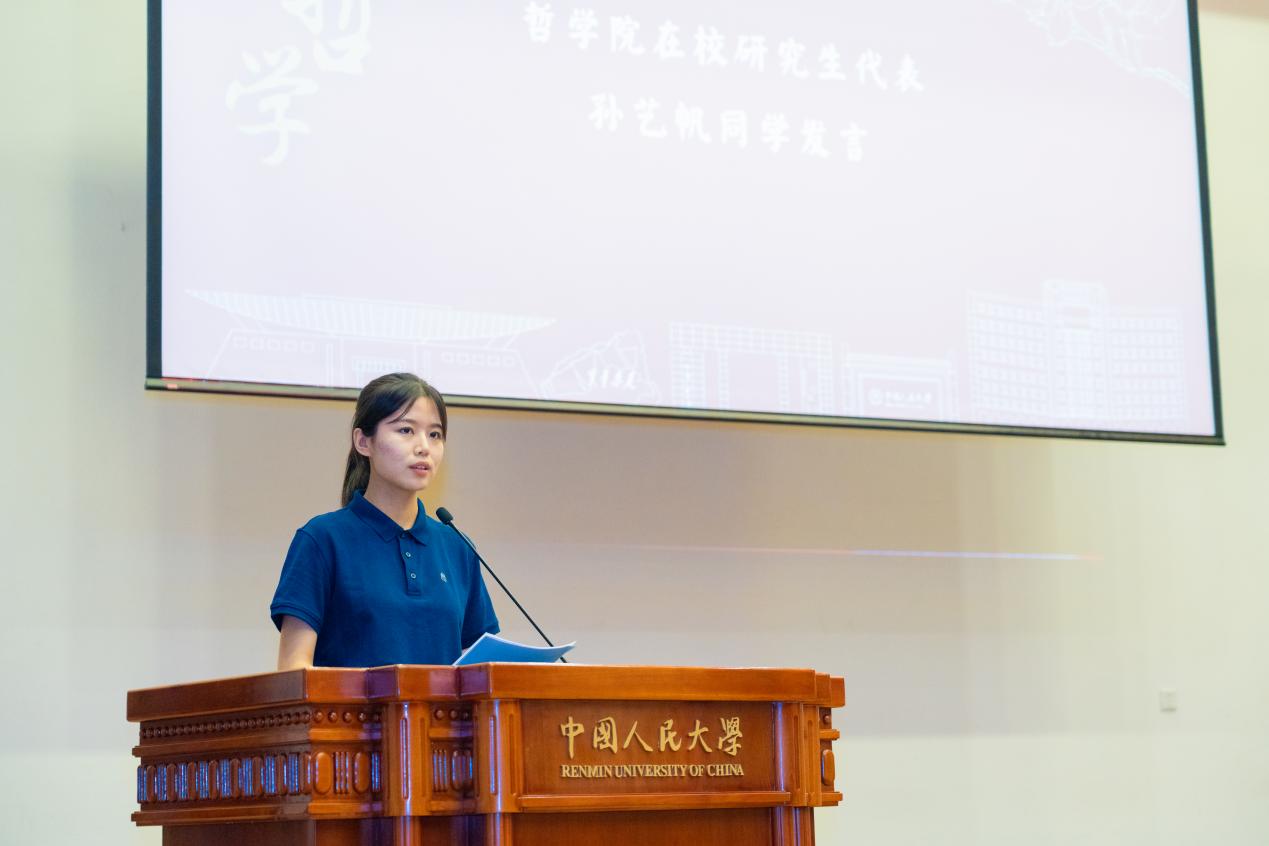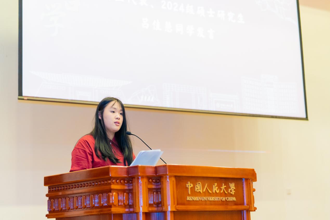 新生代表、2024级硕士研究生吕佳慧鼓励同学们时刻铭记校徽与校训背后的精神意义,建设自己的精神家园。她以“坚持”“合作”“体会”为关键词,激励各位同学锻炼独立思考的能力,在交流中拓展视野,在自我审视的过程中更好地理解世界与自我。未来,在人大求学的时间里,她希望将求学经历化作思想的养料,将哲学之根深植于精神家园。