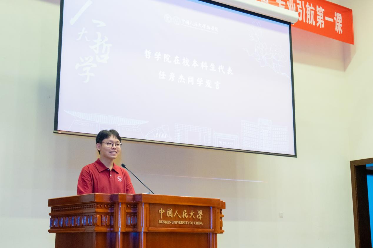在校生代表、2022级强基哲学专业本科生任彦杰代表在校生,向全体新生的到来表示欢迎。关于人生理想和生活计划,他分享了几点思考。首先,要坚持爱智求知,做勤学善思的哲学学生;其次,要牢记实事求是的校训,做脚踏实地的人大学子;最后,要勇于挺膺担当,做不负时代的中国青年。面对充实而忙碌的大学生活,他勉励同学们坚守初心,保持思考,找到属于自己的可能性与确定性。