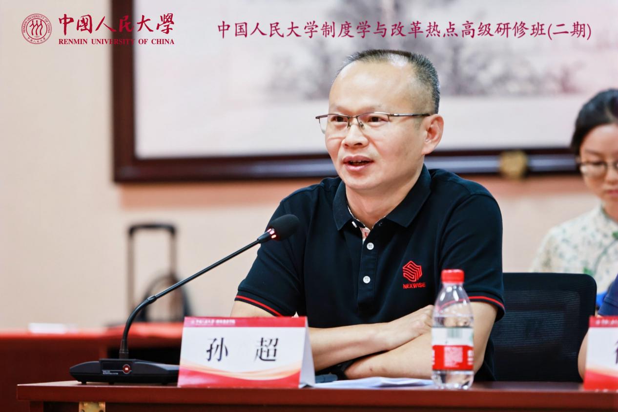 学员代表孙超发言,他回顾了自己从中国人民大学毕业30 年来的实践探索历程,表示如今重归母校参加研修,心怀感恩之情。通过此次研修班学习与探讨,学员们系统学习了制度学理论,深入思考改革热点问题,为提升企业管理实践能力提供了有力支持。最后,他向全体任课教师和全班同学致以祝福。