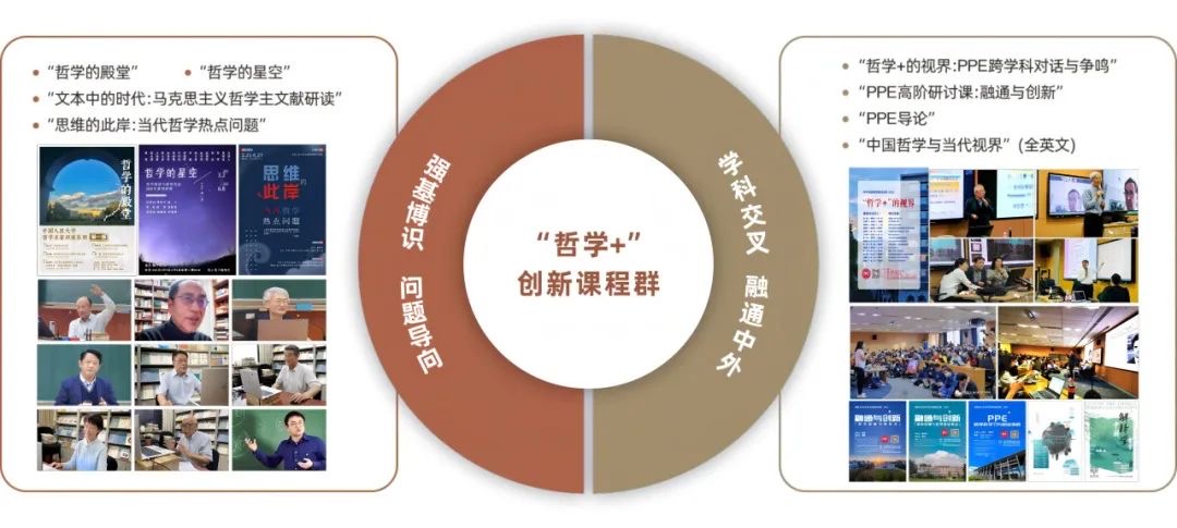以问题为导向,在教学方式、课程设计、师资整合等方面创新探索。理论联系实际,突破单向教学模式。通过新媒体技术应用和教学手段现代化,以学生为主体开展论辩式学习、研讨式学习、情景模拟式学习、实践学习等方式,全方位提高哲学本科生的学习兴趣和思辨能力。面向现实问题,建设哲学精品课程群。近年来,培养学生形成扎根中国大地,运用马克思主义哲学探究现实问题的学术自觉,打造16门“123”本科金课,建设推出10门以问题为导向、以“强基博识”为特色的创新课程。打破学科壁垒,整合教学研团队。促进院际、校际、国际教学资源合作,汇聚教学研共同体,实现教学经验交流、教学资源共享、教学合作探索。