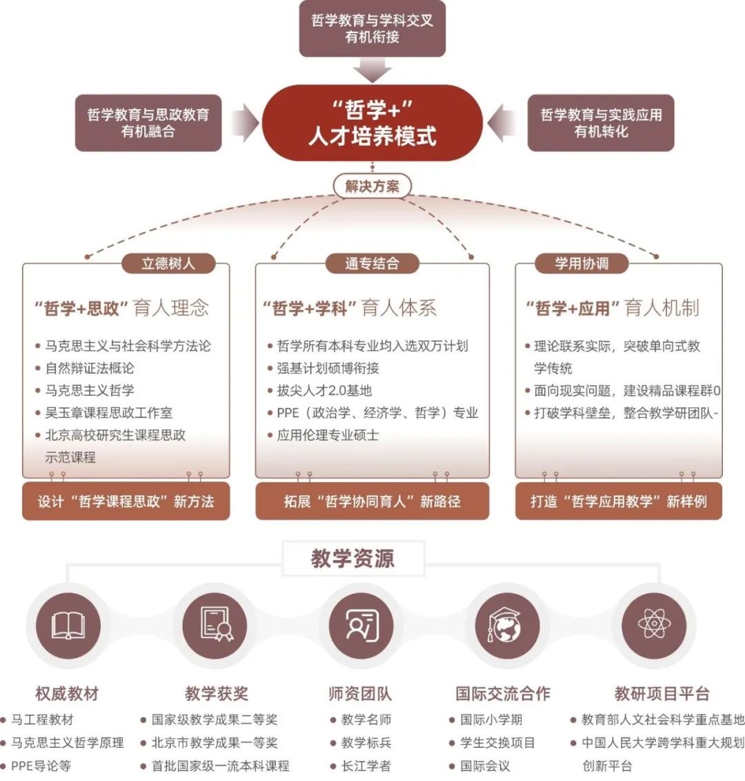 2022年4月25日,习近平总书记在中国人民大学考察时强调培养新时代“复兴栋梁、强国先锋”,希望中国人民大学落实立德树人根本任务,传承红色基因,让听党话、跟党走的信念成为人大师生的自觉追求。为贯彻落实习近平总书记重要讲话精神,中国人民大学“哲学+”教学团队立足培养有理想信念、有理论思维、有现实关怀的“复兴栋梁、强国先锋”,针对传统哲学教育与思政教育、学科交叉、实践应用结合不够紧密的教学问题,围绕教学方式创新、教学体系改革和教学成果应用,推动哲学教育内涵式发展,成效显著。“哲学+”教学团队成员曾获国家级高等教育教学成果二等奖、北京市高等教育教学成果一等奖、北京高校教学名师奖。曾获教育部基础学科拔尖计划2.0重点项目、教育部首批新文科研究与改革实践项目立项,在提高哲学人才培养质量方面做出了有效探索。