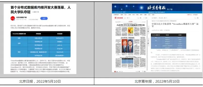 学生团队获得首届OceanBase数据库大赛冠军,《北京日报》《北京青年报》进行了报道