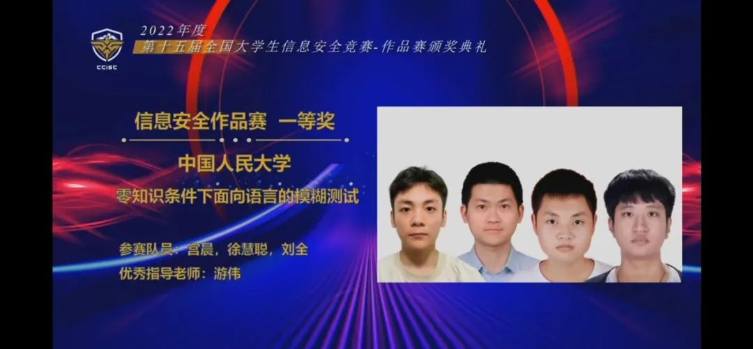 学生团队获得第十五届全国大学信息安全竞赛一等奖