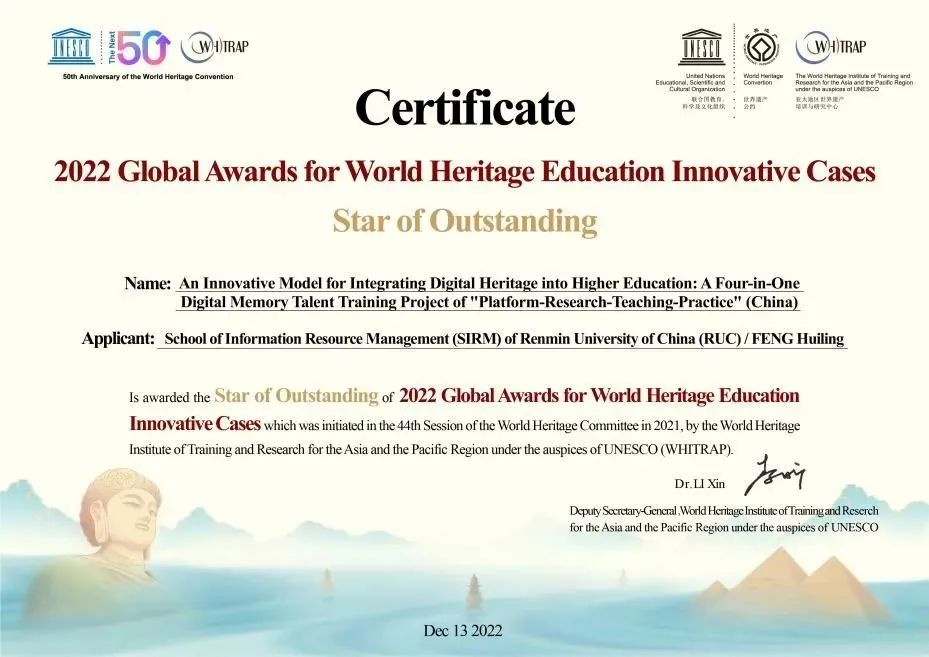 “四位一体数字记忆人才培养:数字遗产融入高等教育新模式”项目获联合国教科文组织全球世界遗产教育创新案例卓越之星奖(Award: Star of Outstanding)