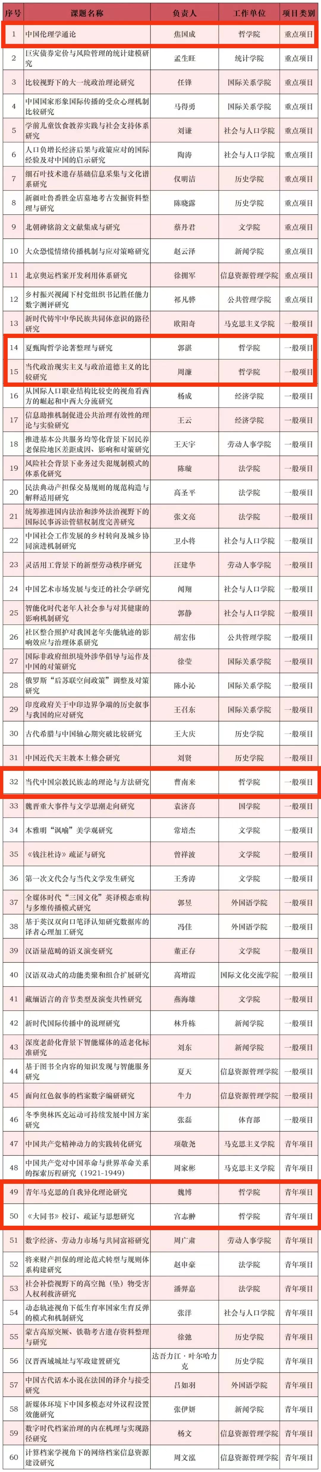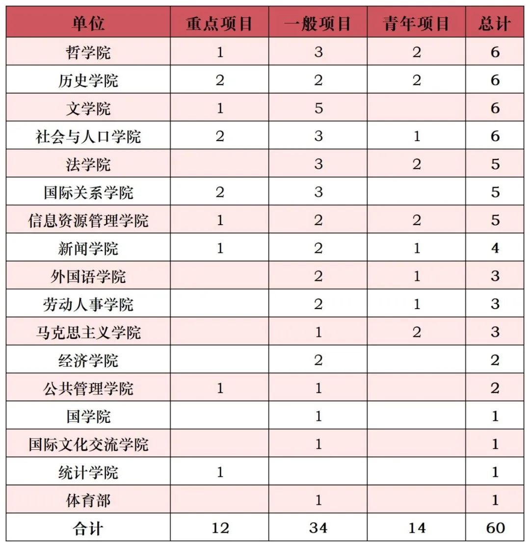 日前,全国哲学社会科学工作办公室公布了2022年度国家社会科学基金年度项目和青年项目的立项名单,中国人民大学获得立项60项,创历史新高。其中重点项目12项,一般项目34项,青年项目14项,立项总数和重点项目立项数均位居全国高校第一。