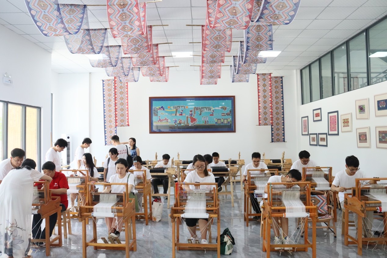 随后,调研团来到沙道沟镇沙町湾,体验非物质文化遗产西兰卡普制作工艺,并与非遗文化传人谭艳宾、谭艳华交流西兰卡普制作的传承之道和创新思维。下午,调研团到彭家寨体验土家吊脚楼的独特风貌和生活方式,了解土家族传统艺术和民俗习惯,感受宣恩县在现代化进程中协同自然生态保护与原生文化传承所做的努力。