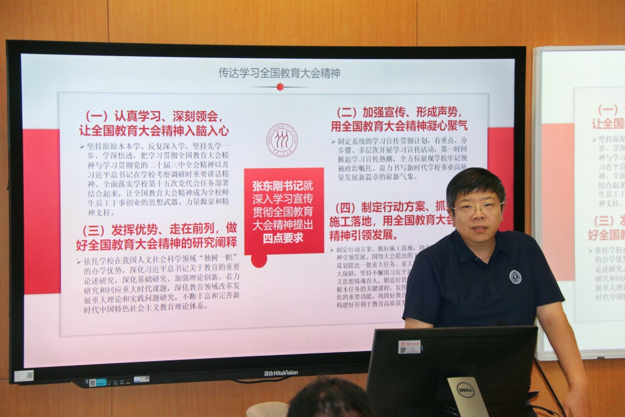 臧峰宇传达了学习习近平总书记在全国教育大会上的重要讲话精神和全国教育大会精神。习近平总书记的重要讲话深刻回答了新时代新征程为什么要建设教育强国、建设什么样的教育强国、怎样建设教育强国等一系列重大问题,把党对中国特色社会主义教育发展规律的认识提升到新高度,是指导新时代新征程教育工作的纲领性文献。张东刚书记就深入学习宣传贯彻全国教育大会精神提出四点要求:一是认真学习、深刻领会,让全国教育大会精神入脑入心;二是加强宣传、形成声势,用全国教育大会精神凝心聚气;三是发挥优势、走在前列,做好全国教育大会精神的研究阐释;四是制定行动方案、抓好施工落地,用全国教育大会精神引领发展。林尚立校长强调,深入学习贯彻全国教育大会精神,必须不断深化对教育强国建设的规律性认识,必须牢牢把握教育的政治属性、人民属性、战略属性,必须牢牢把握教育强国的“六大特质”。