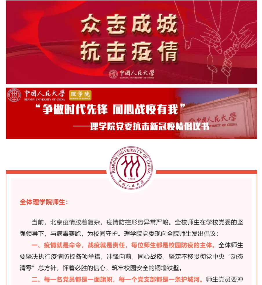 张鹏举、马建波、范婷、李京徽四位老师自愿参加学校疫情防控志愿服务,在世纪馆为广大师生提供核酸检测保障服务;在学校封闭管理后,张鹏举、刘劲杨、杨澜洁、卫一帆4名教职工党员自愿“逆行”,第一时间由校外家中返校,在办公室搭建简易床,24小时值守校园,为同学们提供稳妥、安全的坚强保障,还为在校外居住的教职工挂号取药、浇灌植物;党员先锋队中的学生党员为特殊生活需求学生主动购买水果,为存在特殊生活困难的同学们进行核酸提醒和打卡帮扶;在校外居住的师生调动一切可以调动的力量,为校内值守的老师们提供充分的物资保障和暖心关怀……