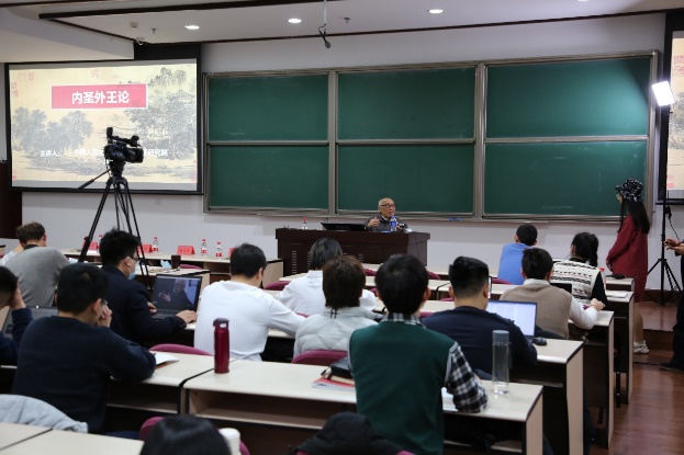著名哲学家、中国人民大学荣誉一级教授张立文先生为同学们授课。张立文先生以“内圣外王论”为主题,从“内圣外王说”“各正性命”“尽心知性”“性情中和”“霸王道杂”等五个部分加以详细阐释。张立文先生强调,“内圣外王”是中国哲学理论思维的重要原理,是人们的内在世界与外在世界、精神世界与事功世界的融合体。我们要通过修心养性以达至善。这是为家为国保合太和的大本达道、位育天地万物的根基,内圣外王的根据和本源,要继承、弘扬中华优秀传统文化,努力实现中华民族伟大复兴。