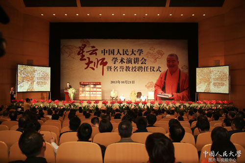 2013年10月21日下午,台湾宗教界知名人士、佛光山开山宗长星云大师访问中国人民大学,接受名誉教授聘任并作学术演讲,勉励大学生爱国家爱社会,发心立志登高望远。
