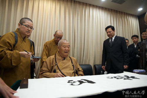 星云大师此行还应邀为中国人民大学题写了“明德”二字,希望学校践行大学之道,明德博学、臻于至善。