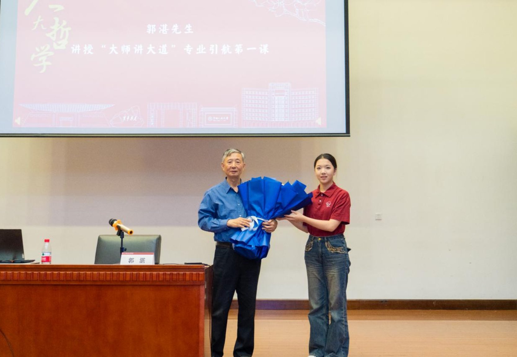 在讲座互动环节,臧峰宇院长向大家介绍了银河Galaxy 2024级PPE专业本科生。在本次军训中,他们所在的一连是唯一获得“陕公连”荣誉称号的连队。希望“人大哲学人”能够传承红色基因,庚续红色血脉,以奋斗姿态做复兴栋梁、强国先锋。最后,学生代表向郭湛教授献花,在场全体师生祝愿郭湛教授身体健康、学术之树常青。